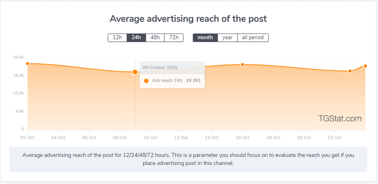 - Average advertising reach per post. Reflects the number of views within the channel itself, excluding reposts. Useful for an objective assessment of content placement effectiveness directly on the selected platform.